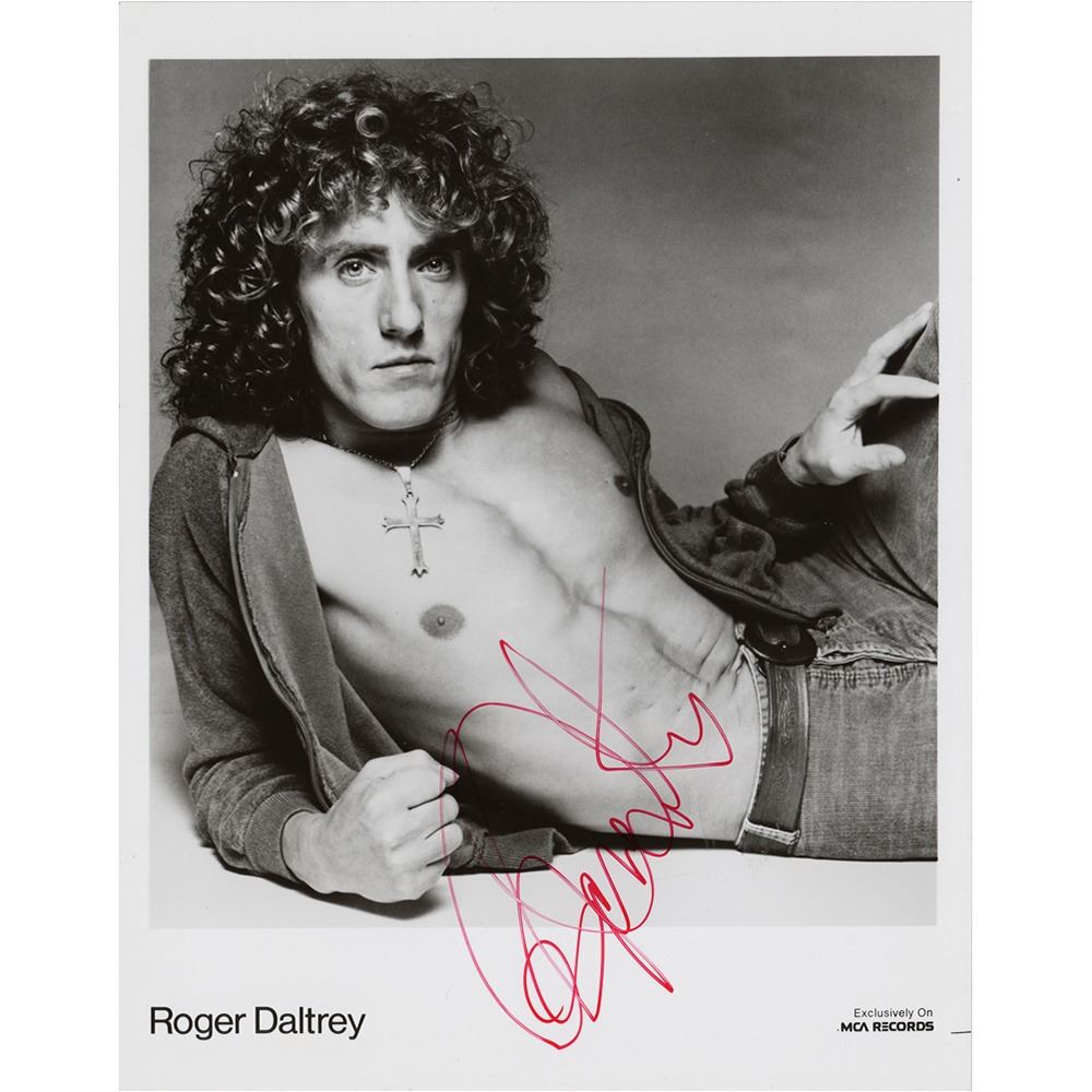 Glossy 8 x 10 MCA Records publicity photo of The Who singer in a seductive rock star pose, signed nicely in red felt tip by Roger Daltrey. In fine condition.