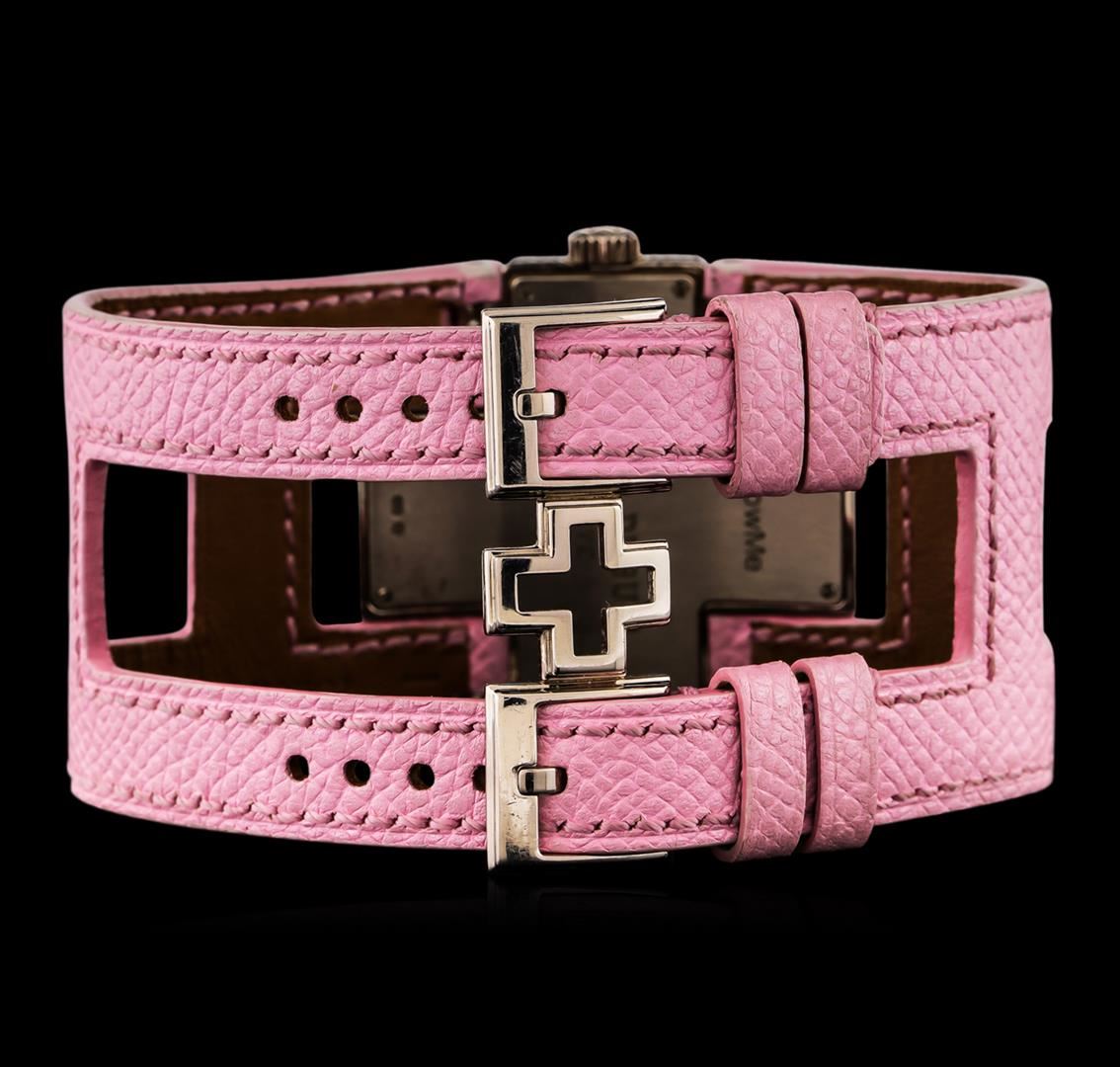 One, Roger Dubuis "Follow Me" wristwatch electronically tested 18KT White Gold, Cross Shaped Case: 39 x 39mm, Case Shoulders: set with diamonds, Swiss Hallmarked Case Back: engraved with the manufacturers name and model number, Crown: scalloped, Bezel: diamond set, Crystal: domed synthetic sapphire. Movement: quartz, Dial: Pink color with exaggerated Roman numerals, and Blued Steel hands, Bracelet: saddle stitched Roger Dubuis leather strap. Condition: G-5 Fine. Seven inch length, adjustable. Containing: Approximately One Hundred Ninety-Six prong set round brilliant cut diamonds, measuring 1.20 - 1.10mm (depth est.) approximate total weight of Stones = 1.08ct. Graded in the setting. Clarity: VVS-1 to VS-1. Color: E - G. Total Weight of Diamonds 1.08ct. Weight of Watch 82.66gm. AIG Appraised at $16,000.00.