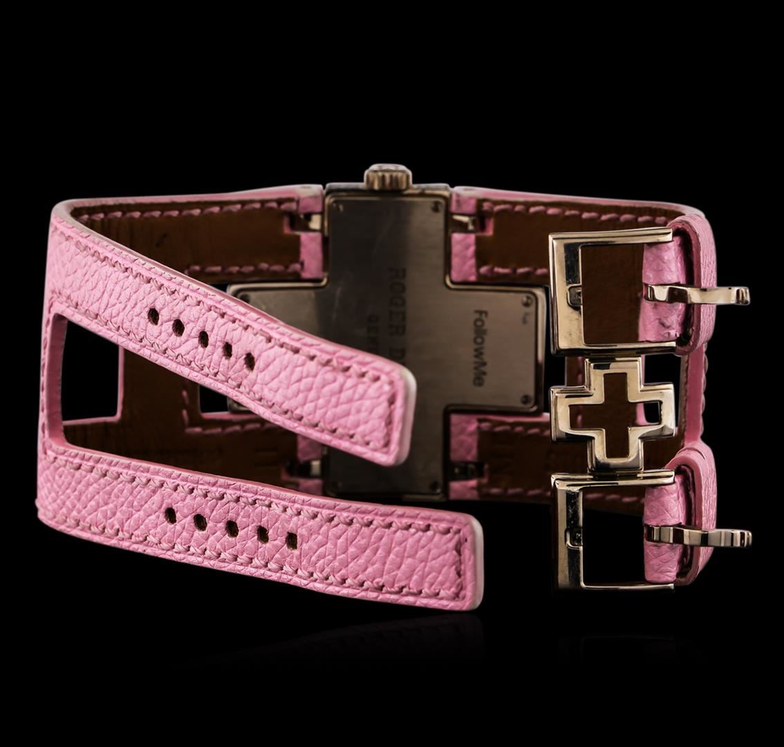 One, Roger Dubuis "Follow Me" wristwatch electronically tested 18KT White Gold, Cross Shaped Case: 39 x 39mm, Case Shoulders: set with diamonds, Swiss Hallmarked Case Back: engraved with the manufacturers name and model number, Crown: scalloped, Bezel: diamond set, Crystal: domed synthetic sapphire. Movement: quartz, Dial: Pink color with exaggerated Roman numerals, and Blued Steel hands, Bracelet: saddle stitched Roger Dubuis leather strap. Condition: G-5 Fine. Seven inch length, adjustable. Containing: Approximately One Hundred Ninety-Six prong set round brilliant cut diamonds, measuring 1.20 - 1.10mm (depth est.) approximate total weight of Stones = 1.08ct. Graded in the setting. Clarity: VVS-1 to VS-1. Color: E - G. Total Weight of Diamonds 1.08ct. Weight of Watch 82.66gm. AIG Appraised at $16,000.00.