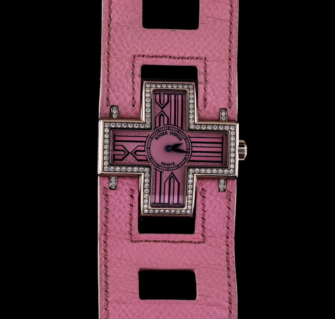 One, Roger Dubuis "Follow Me" wristwatch electronically tested 18KT White Gold, Cross Shaped Case: 39 x 39mm, Case Shoulders: set with diamonds, Swiss Hallmarked Case Back: engraved with the manufacturers name and model number, Crown: scalloped, Bezel: diamond set, Crystal: domed synthetic sapphire. Movement: quartz, Dial: Pink color with exaggerated Roman numerals, and Blued Steel hands, Bracelet: saddle stitched Roger Dubuis leather strap. Condition: G-5 Fine. Seven inch length, adjustable. Containing: Approximately One Hundred Ninety-Six prong set round brilliant cut diamonds, measuring 1.20 - 1.10mm (depth est.) approximate total weight of Stones = 1.08ct. Graded in the setting. Clarity: VVS-1 to VS-1. Color: E - G. Total Weight of Diamonds 1.08ct. Weight of Watch 82.66gm. AIG Appraised at $16,000.00.