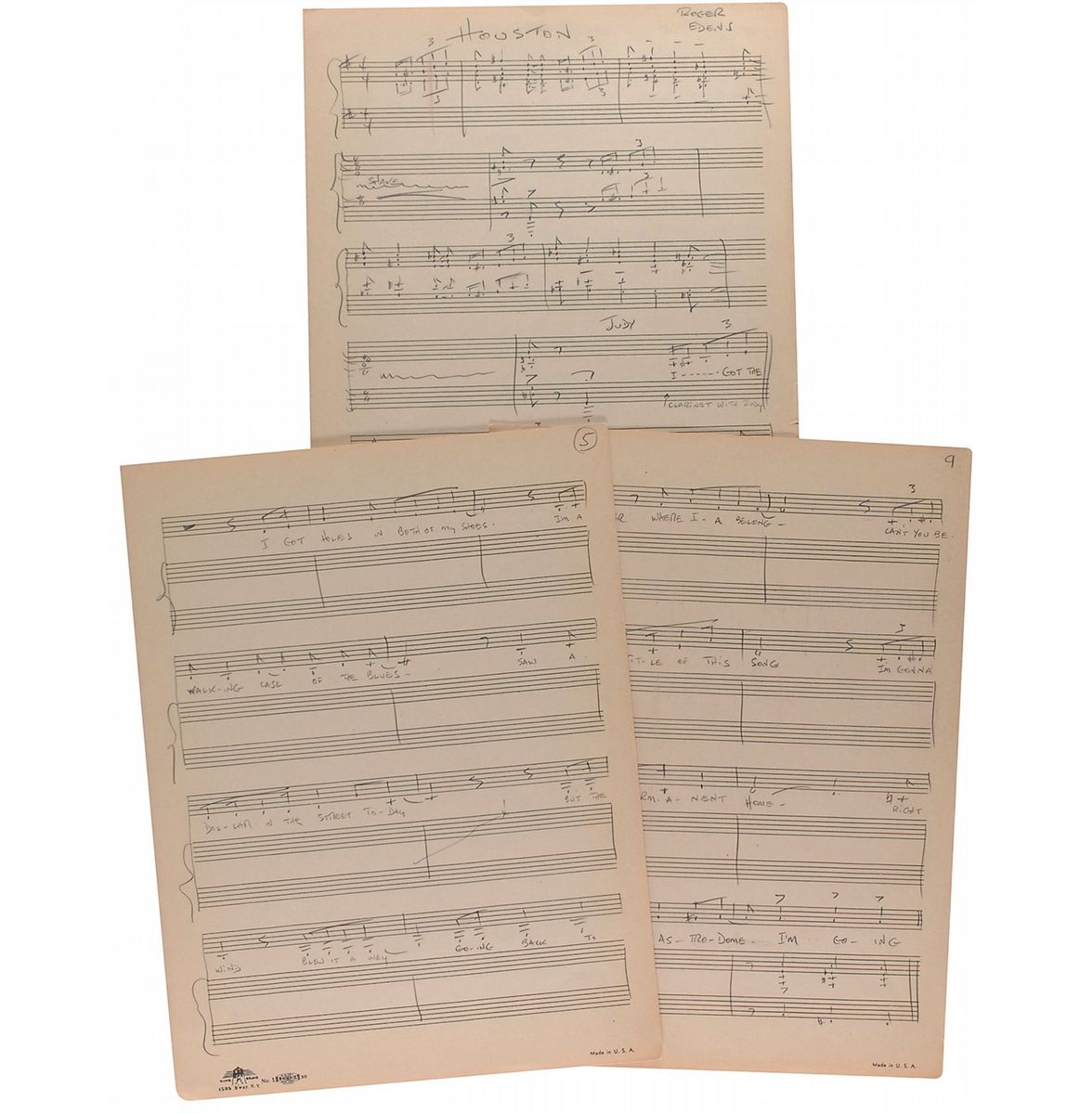 Academy Award–winning composer and producer (1905–1970) who played an integral role in MGM’s musical films during Hollywood’s ‘golden age.’ His credits include Easter Parade, Funny Face, and Meet Me in St. Louis. Handwritten musical manuscript in pencil for ‘Houston,’ six musically-lined pages both sides, 9.5 x 12.5, titled and signed at the top of the first page. Edens writes 96 bars of music and lyrics for ‘Houston,’ a likely unpublished song originally prepared for Judy Garland. In fine condition.