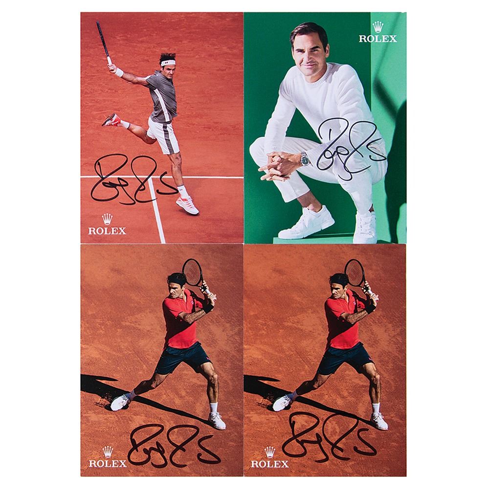 Four color promo cards for Rolex, 4 x 5.75, each signed in black felt tip by tennis legend Roger Federer. In overall very fine condition.