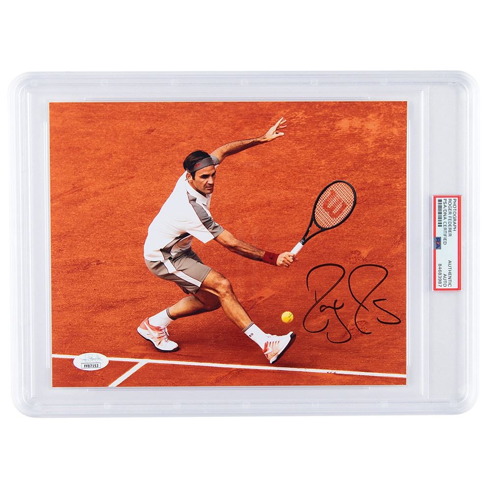 Color satin-finish 10 x 8 photo of Roger Federer in action on a clay tennis court, nicely signed in felt tip. In very fine condition, with a JSA label affixed to the lower left corner. Encapsulated in a PSA/DNA authentication holder.