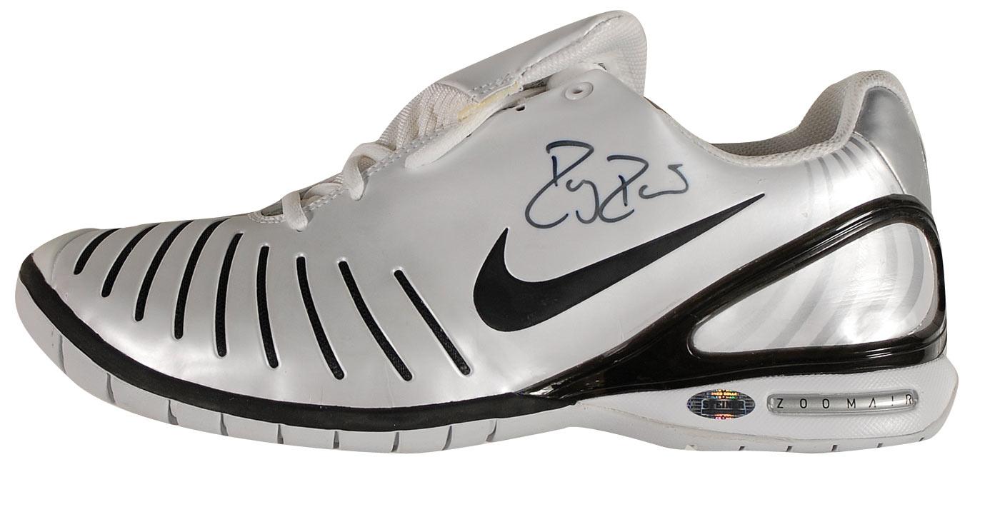 Black and white Nike Zoom Air sneaker, size 12, signed on the side in black felt tip by Federer. In fine condition, with some slight haloing to signature and a Steiner hologram affixed to sneaker.