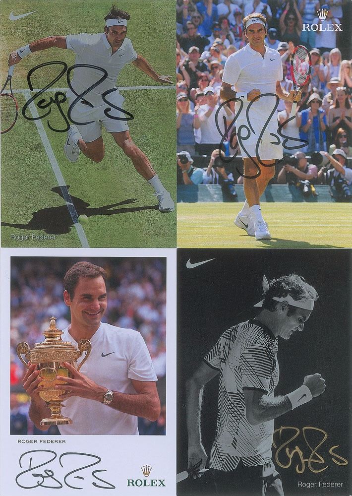Set of four Nike and Rolex publicity cardstock photos of Federer, each 4 x 5.75, signed in gold ink or black felt tip. In overall fine condition.
