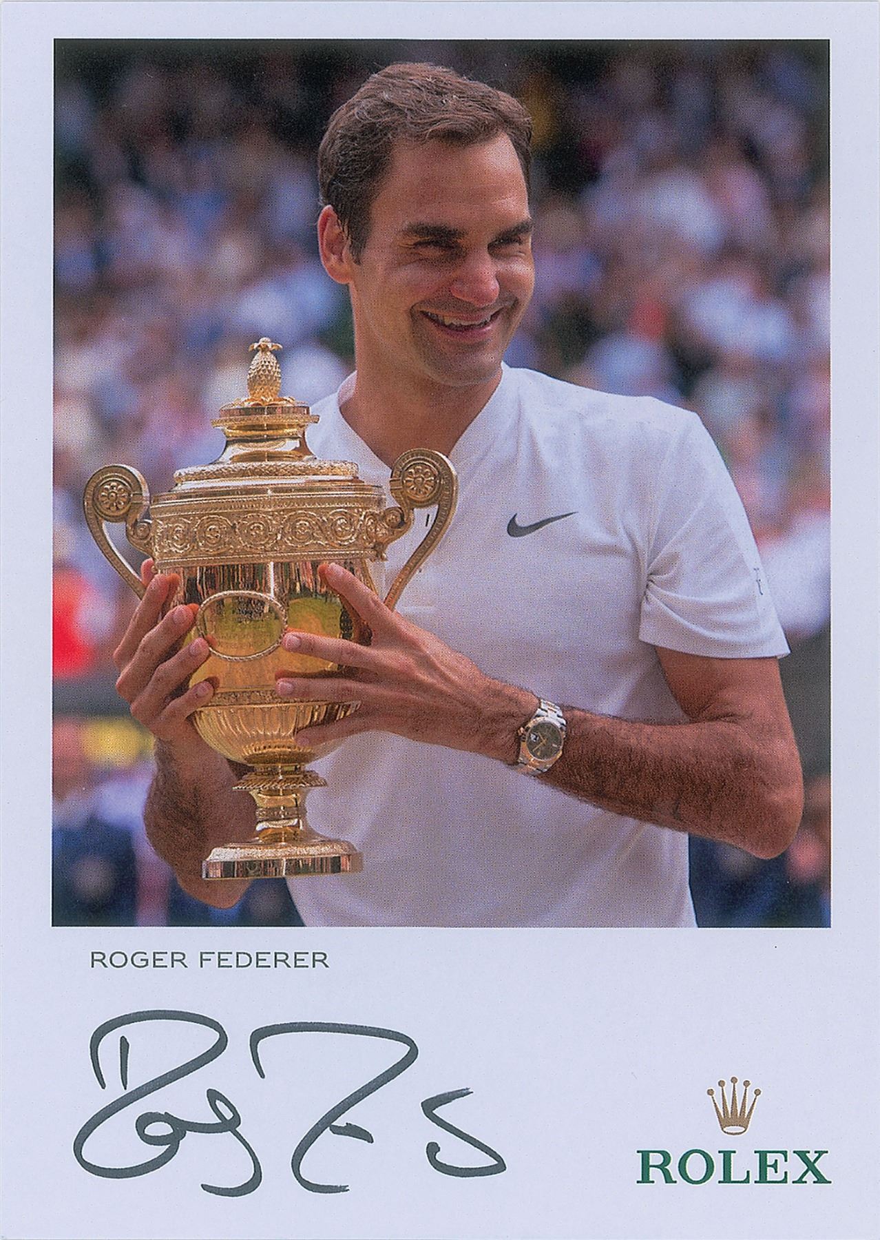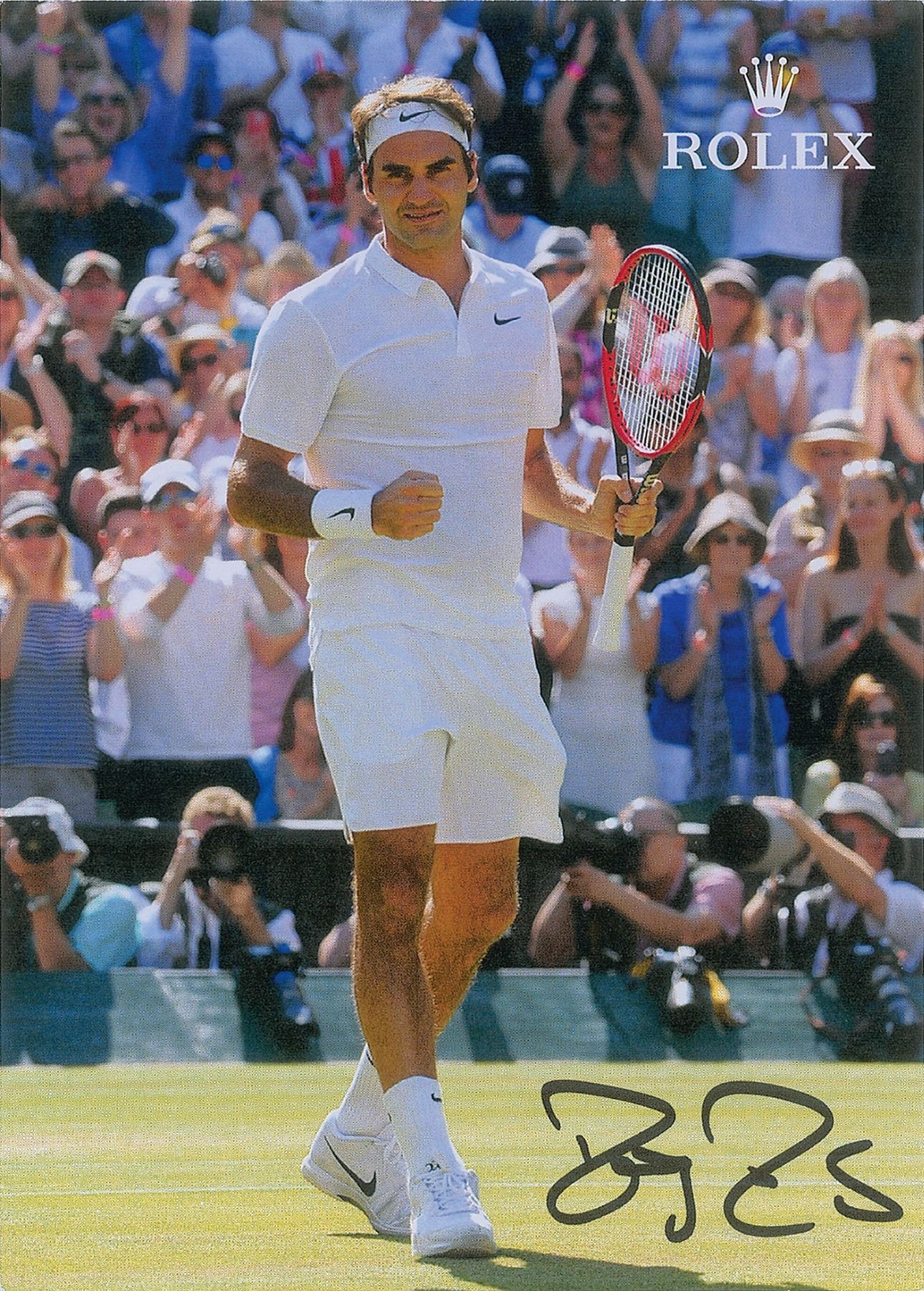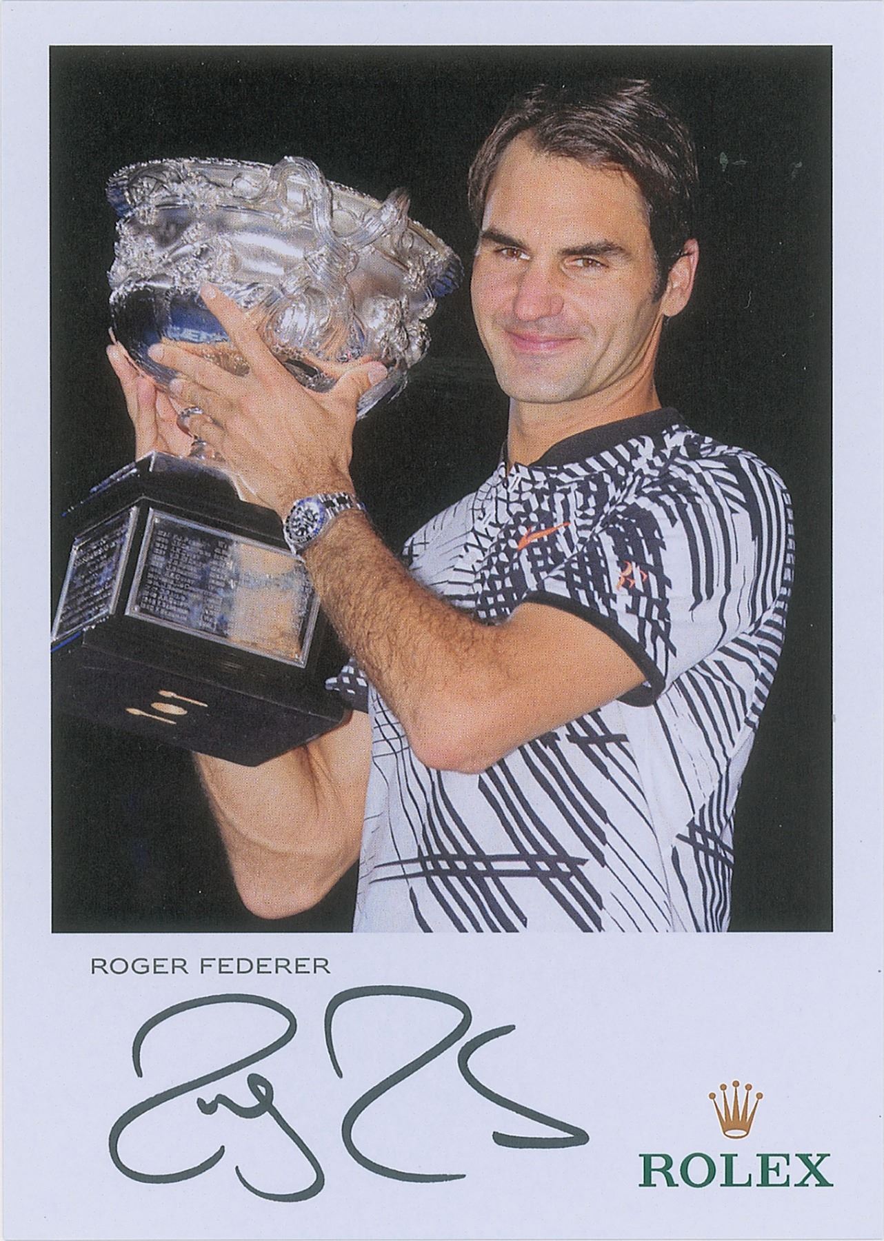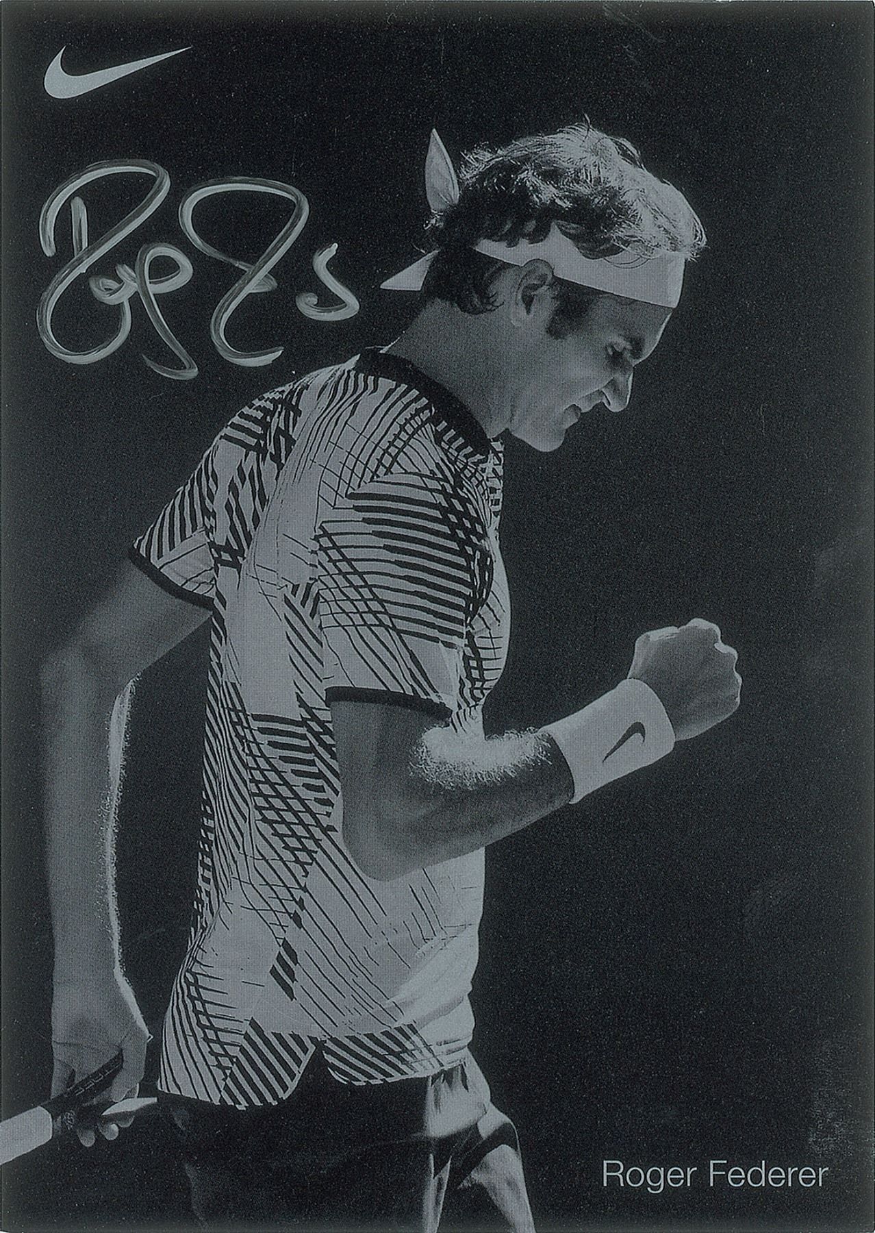 Set of four Nike and Rolex publicity cardstock photos of Federer, each 4 x 5.75, signed in silver ink or black felt tip. In overall fine condition.