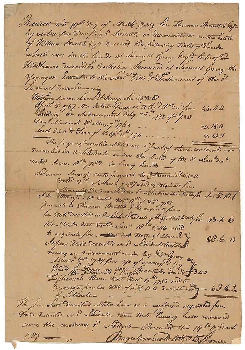 Connecticut lawyer and politician (1762–1812) who declined John Adams’s request for him to serve as secretary of war. Rare ADS, one page, 8 x 11.5, March 19, 1789. Financial document regarding the execution of an estate. Affixed to a same-size sheet. In very good condition, with separations to intersecting folds (one passing through a single letter of the signature).