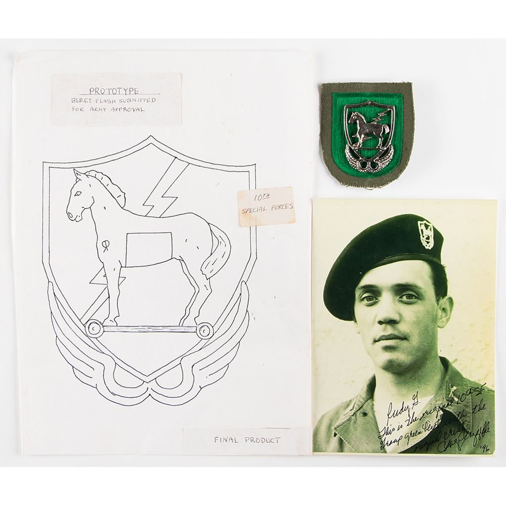 Three items: a semi-glossy 5 x 7 photo of Roger M. Pezzelle wearing his Green Beret hat with 10th Special Forces Group insignia, signed and inscribed in black ink, “Rudy G., This is the original 10th SF Group green beret with the original crest, R. M. Pezzelle, ‘96â€; an original 10th Special Forces Group badge with green beret flash; and an original drawing of the insignia by Pezzelle, accomplished in black ink on an off-white 8 x 11 sheet, with affixed labels marked “Prototype, Beret flash submitted for Army approval,†“10th Special Forces,†and “Final Product.†In overall very good to fine condition, with pin holes to drawing and photo.