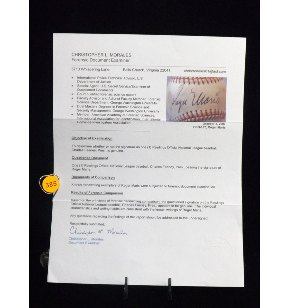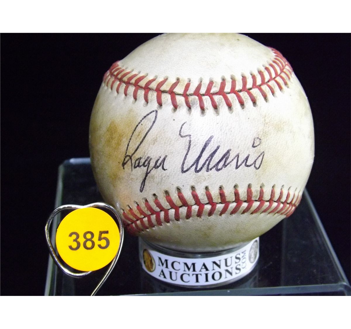 Roger Maris Autographed Baseball. Rawlings Official National League Ball. Appraised or estimated retail value $6000. COA by Christopher Morales. All Sales Final. Please see terms and conditions of auction.
