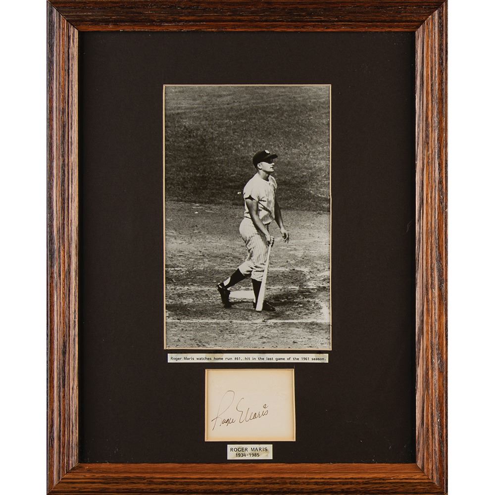Vintage felt tip signature, "Roger Maris,†on an off-white 2.75 x 2.25 card. Matted and framed with a photo of Maris watching his famous 61st home run sail into the stands to an overall size of 12.5 x 15.5. In fine condition, with faint toning and some staining to captions on the mat.