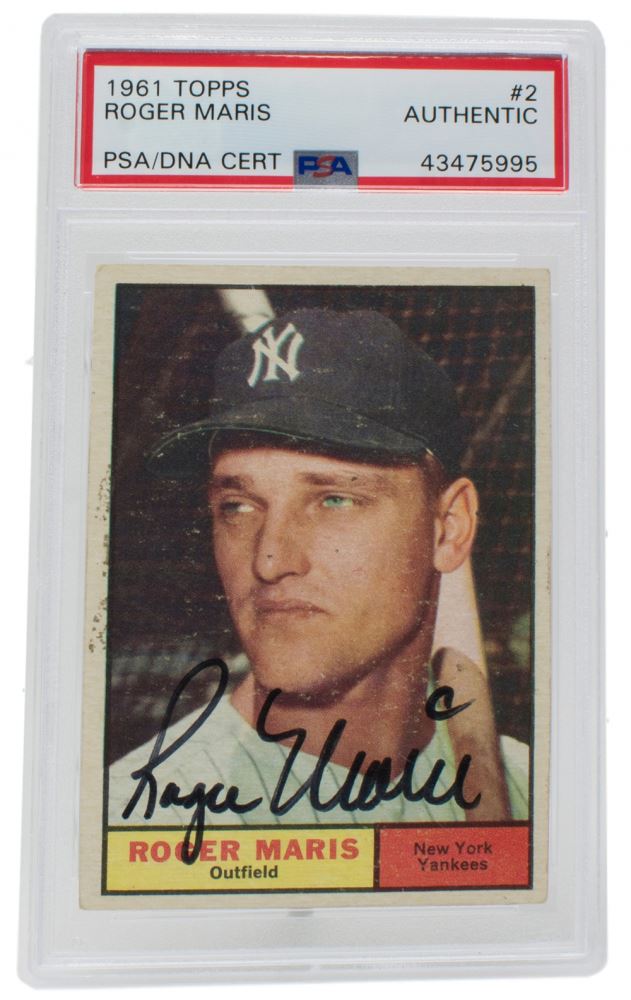 1961 Topps #2 has been hand-signed in black felt-tip pen by Roger Maris (D. 1985, New York Yankees). Please see scans for details regarding the condition of the card.