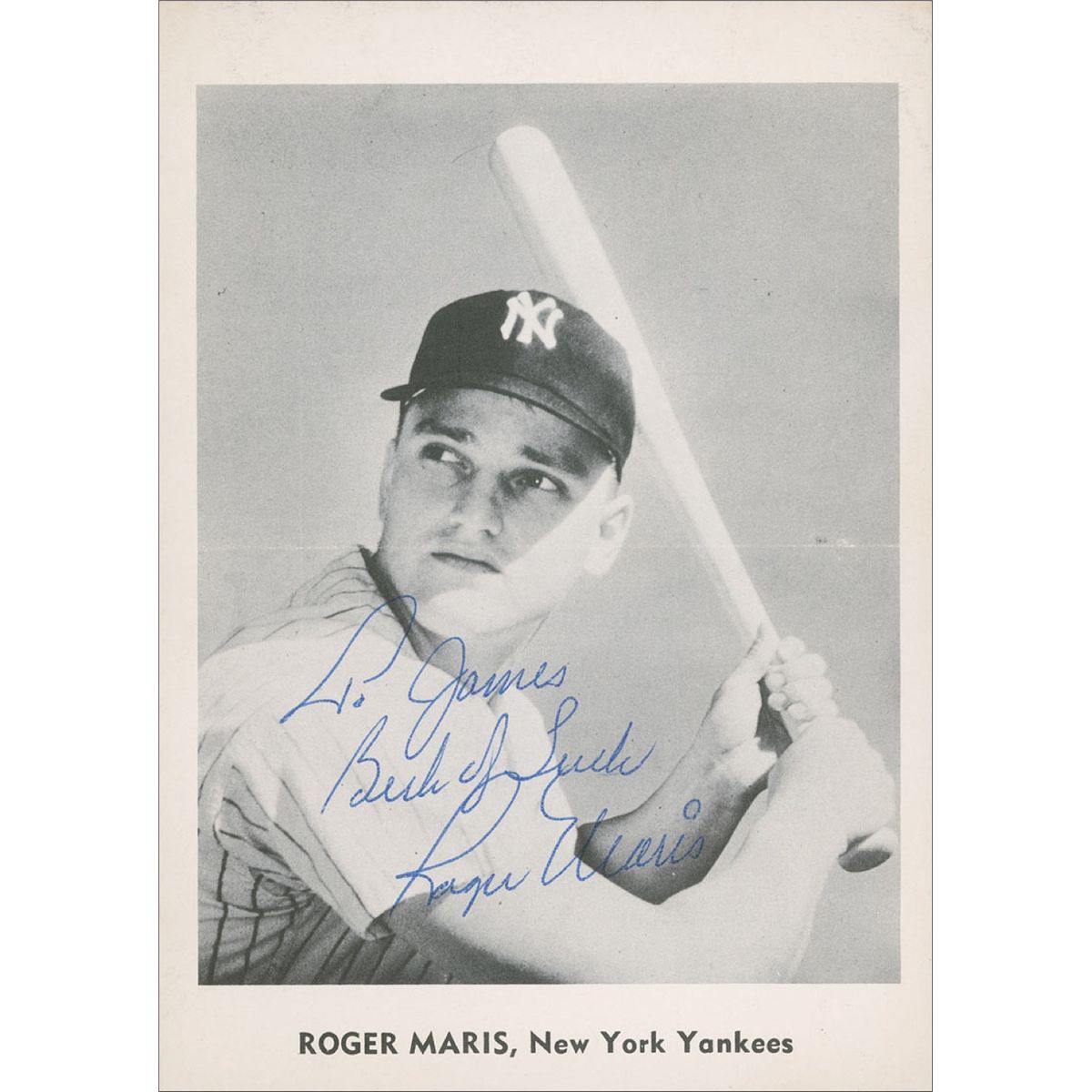 Rare signed photo of New York Yankees Roger Maris, inscribed in large writing, ''To James / Best of Luck / Roger Maris''. 5'' x 7'' photo on heavy paperstock is in very good condition with one horizontal center crease and light wear. Accompanied by PSA/DNA COA.