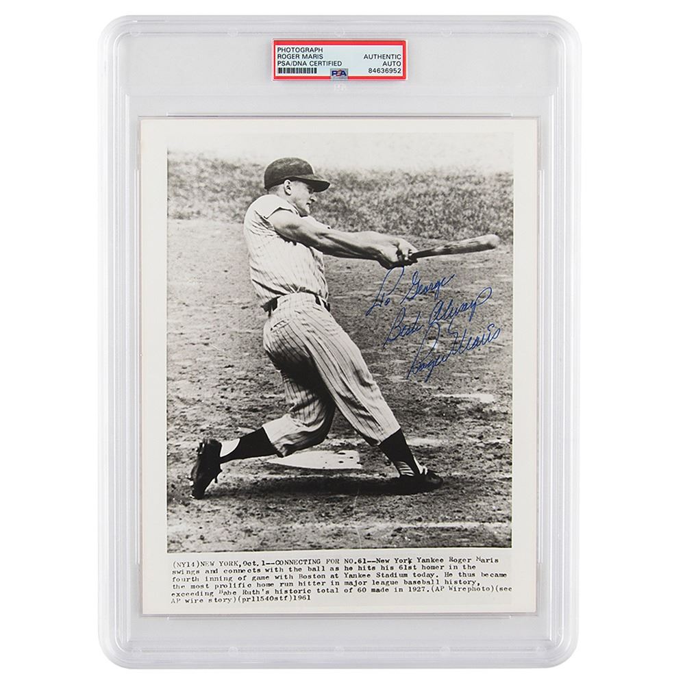 Very appealing semi-glossy 8 x 10 photo of Maris hitting his record-breaking 61st home run, signed and inscribed in blue felt tip, "To George, Best Always, Roger Maris." Reverse bears "This Paper Manufactured by Kodak" watermarks. In very fine condition. Encapsulated in a PSA/DNA authentication holder.