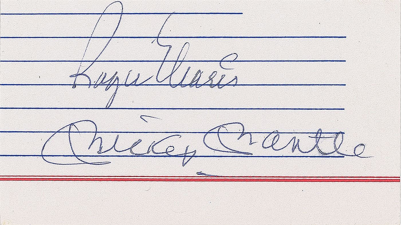 Desirable pair of bold ballpoint signatures, "Roger Maris" and "Mickey Mantle," on a 4 x 2.25 white lined slip. In fine condition. A sought-after pairing of the '61 home run heroes.