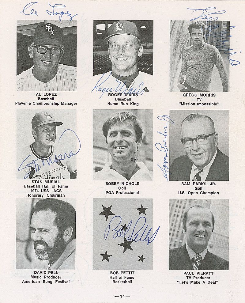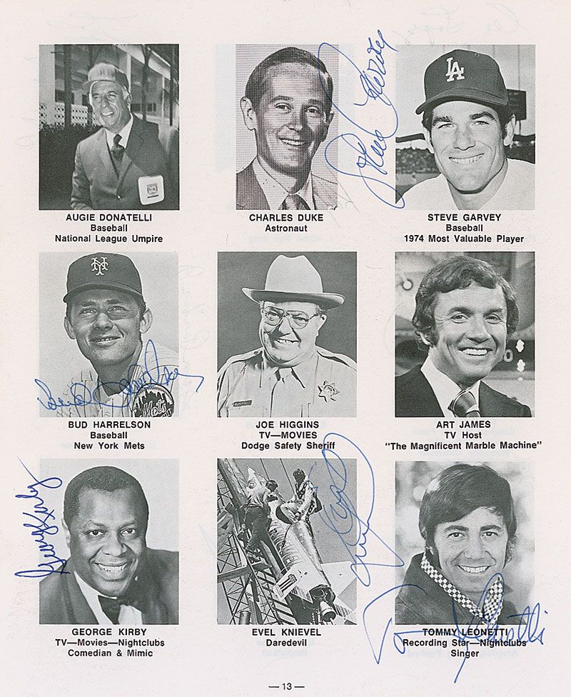 Program page featuring images of a number of different athletes and celebrities, 7 x 8.5, signed on both sides in blue ballpoint by 11 of those pictured. Signers are: Roger Maris, Stan Musial, Al Lopez, Greg Morris, Sam Parks, Jr., Bob Pettit, Evel Knievel, Steve Garvey, Bud Harrelson, George Kirby, and Tommy Leonetti. In fine condition.
