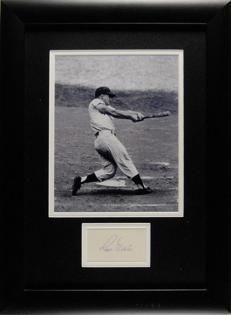 Choice blue ballpoint signature, “Roger Maris,” on an off-white 3.5 x 2 card. Double matted with an unsigned photo of Maris’ historic 61st home run and framed to an overall size of 14 x 19.