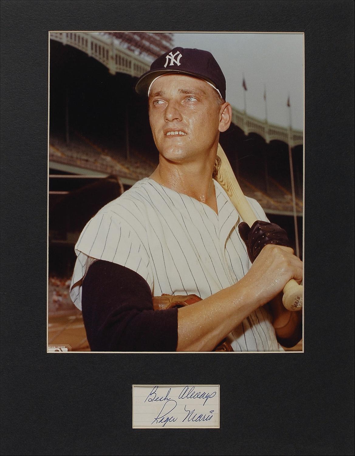 Ballpoint signature, “Best always, Roger Maris,” on an off-white lightly-lined card. Matted with a color glossy photo, to an overall size of 11 x 14. In fine condition, with a couple small tape remnants to card, a bit of light surface loss, not affecting signature, and a matted out inscription.