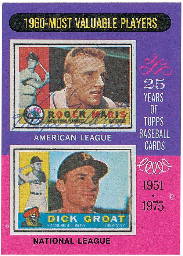 Nice 1975 Topps baseball card #198 featuring 1960 MVPs Roger Maris and Dick Groat, signed in blue ballpoint by Maris. In fine condition, with moderate contrast to the signature.