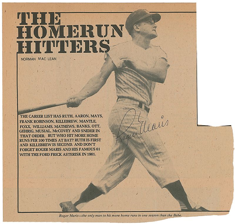 Clipped 8 x 7.5 newspaper photo of Maris watching one of his home runs sail out of the ballpark, signed in black ballpoint. In fine condition, with intersecting folds, one through his last name, irregular edges, and uniform light toning.