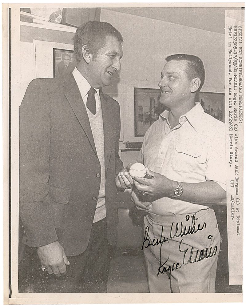 Photocopy of a 7.75 x 9.75 press photo of Maris and Jack Bergamo, signed in black felt tip, “Best wishes, Roger Maris.” In fine condition, with two horizontal mailing folds and some slight haloing to signature and sentiment.