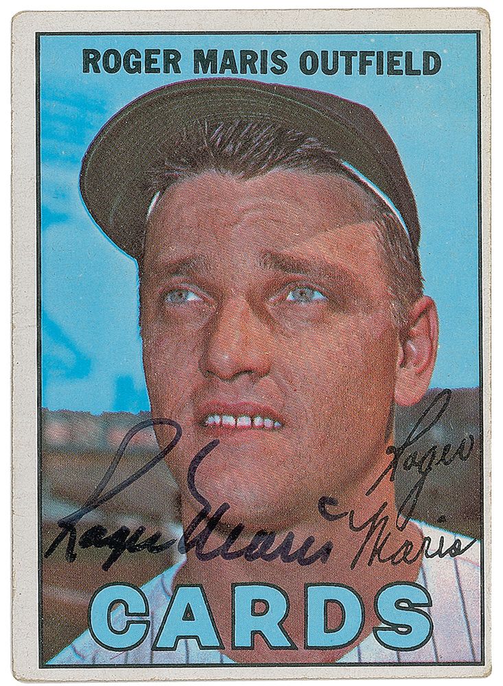 Uncommon 1967 Topps baseball card featuring Maris as a Cardinal, boldly signed on the front in black felt tip. In fine condition, with a mild surface wrinkle to the top and mild corner tip dings.