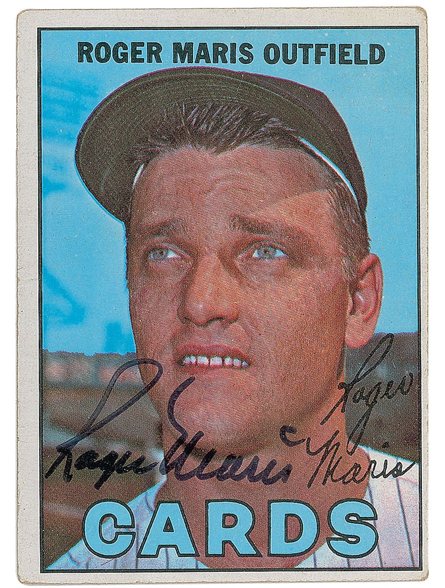 Uncommon 1967 Topps baseball card featuring Maris as a Cardinal, boldly signed on the front in black felt tip. In fine condition, with a mild surface wrinkle to the top and mild corner tip dings.