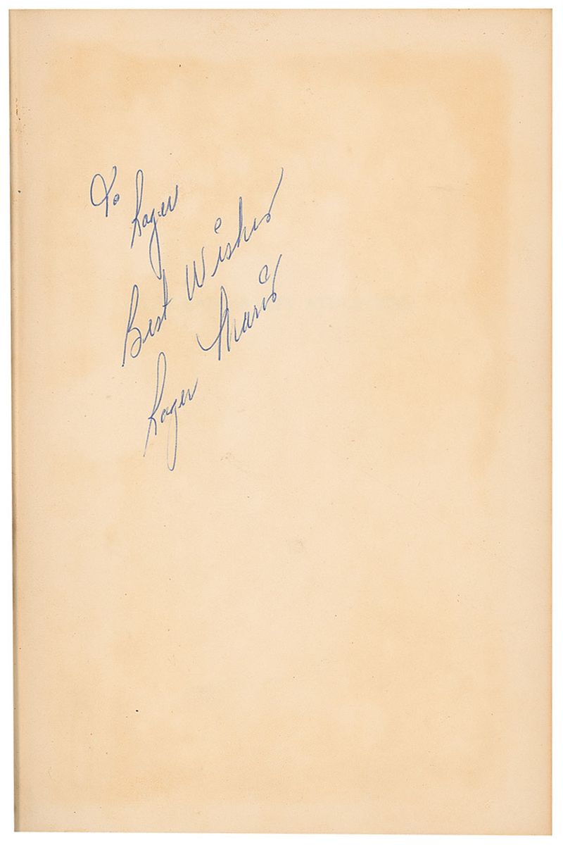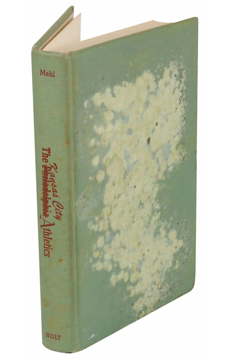 Signed book: The Kansas City Athletics. Later printing. NY: Henry Holt and Company, 1956. Hardcover, 5.75 x 8.5, 222 pages. Signed and inscribed in blue ballpoint on the first free end page, “To Roger, best wishes, Roger Maris.” Autographic condition: a mild block of toning over signature and inscription, otherwise fine. Book condition: G+/None. Green cloth-covered boards; large mildew stain across majority of rear cover; mild foxing, soiling, and wear to exterior; rear hinge cracked; feps yellowed.