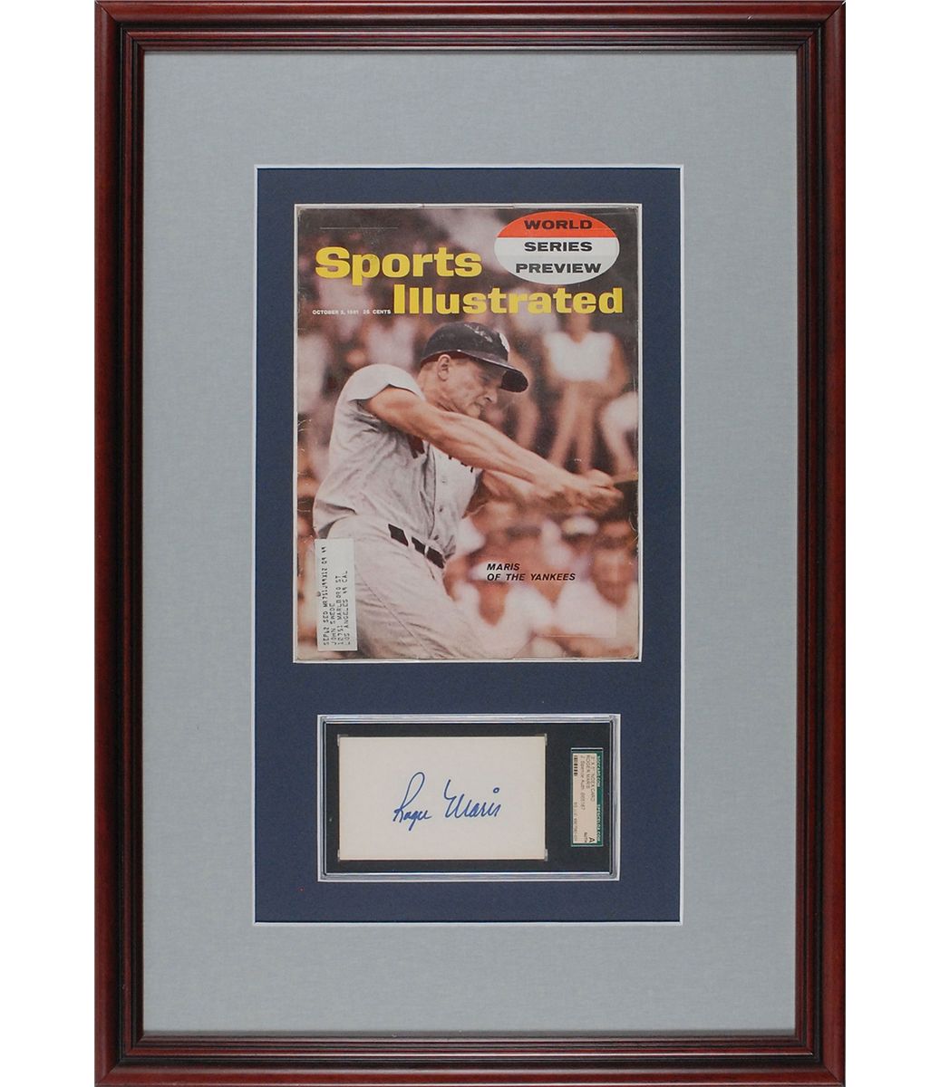 Felt tip signature, “Roger Maris,” on an off-white 5 x 3 card. Encapsulated in a plastic SGC/JSA authentication holder. Attractively double-matted and framed with an original 1961 Sports Illustrated cover to an overall size of 18 x 26.5. In fine condition. Oversized.