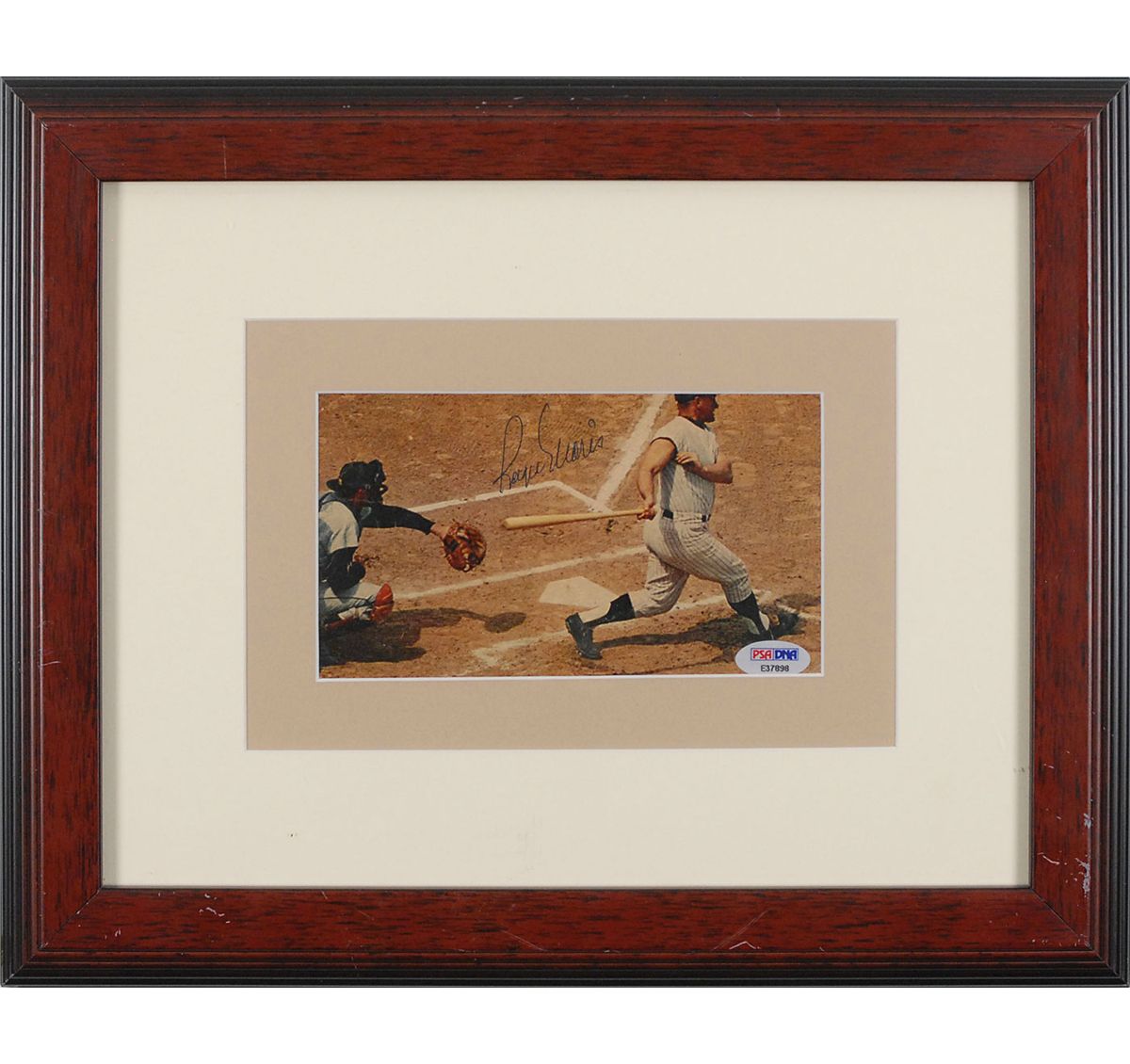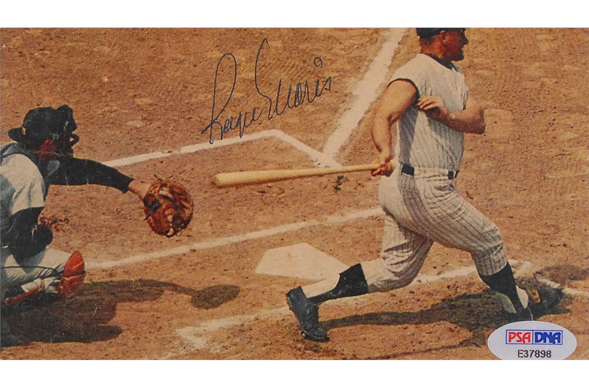 Color 6.75 x 4 magazine photo of Maris following through after a powerful swing, signed in blue ballpoint. Nicely double-matted and framed to an overall size of 15.25 x 12.25. In fine condition, with the top of his head obscured by the mat and a PSA/DNA label affixed to the lower right corner. Accompanied by a full letter of authenticity from PSA/DNA.