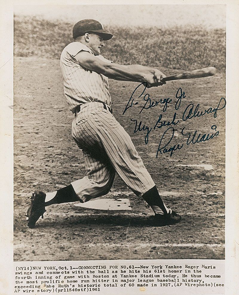 Satin-finish 8 x 10 of a press photo with caption of Maris hitting his record-breaking home run, signed and inscribed in black felt tip, “To George Jr., My best always, Roger Maris.” In fine condition, with a few surface creases and some scattered light soiling to borders.