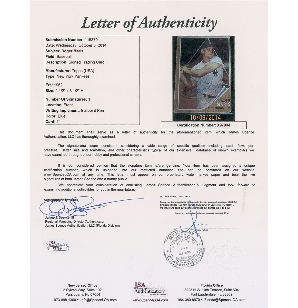 Desirable 1962 Topps #1 baseball card of Roger Maris featuring his record-setting stat line from the previous season on the reverse, signed in blue ballpoint. In very good condition, with some soiling, edge and corner wear, and a light horizontal crease. Accompanied by a full letter of authenticity from JSA.