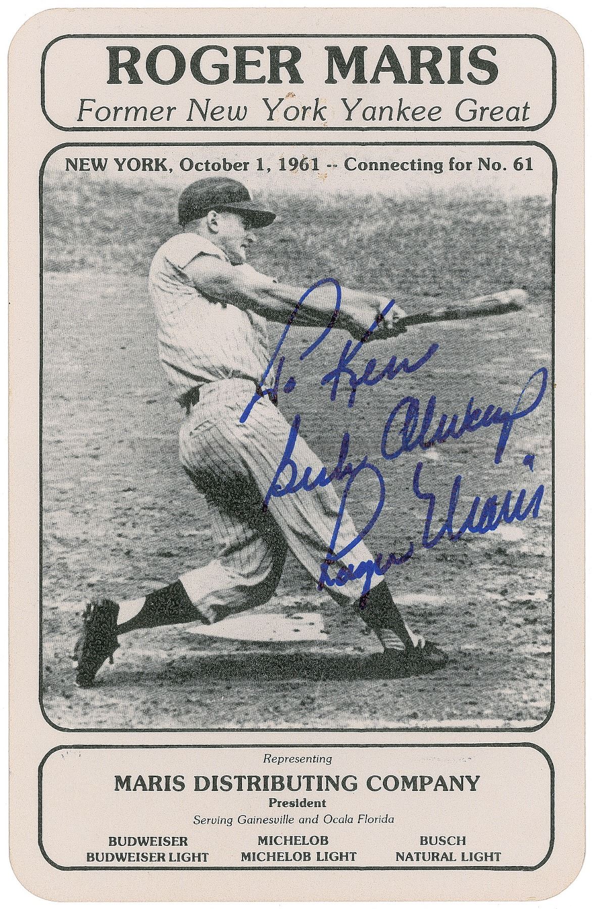 Cardstock 4.5 x 7 promo photo showing Maris connecting for his record-breaking 61st home run, signed and inscribed in blue felt tip, "To Ken, Best Always, Roger Maris.” In fine condition.