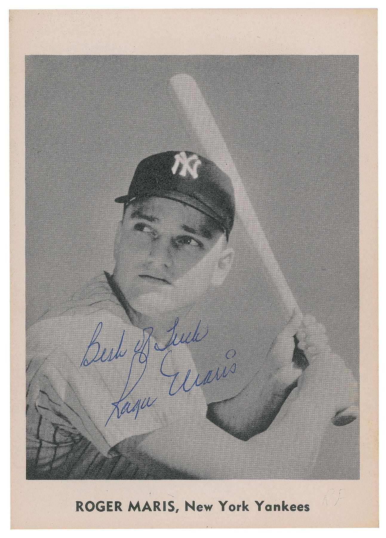 Desirable 5 x 7 paperstock 1958-61 Jay Publishing photo of Maris in his batting stance, nicely signed in blue ballpoint, "Best of Luck, Roger Maris." In fine condition, with a small erasure to the lower right border corner.
