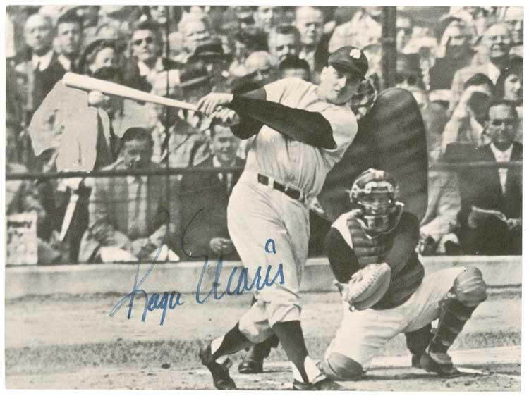 Nice 7.75 x 6 book photo of Maris at bat, signed in blue felt tip. In fine condition. Pre-certified Steve Grad/PSA/DNA and RRAuction COA.