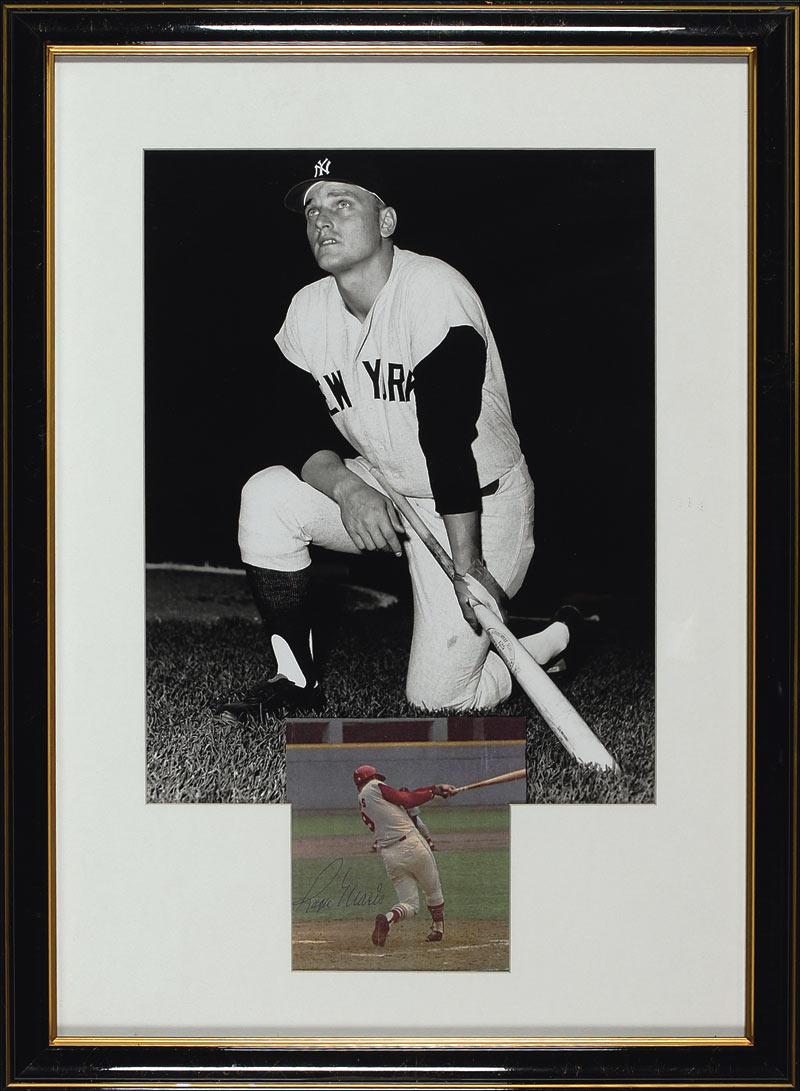 Color 5 x 5.25 magazine photo of Maris at bat for the Cardinals, signed in blue ballpoint. Matted and framed with an 11 x 14 photo of Maris in his Yankees uniform, to an overall size of 16.75 x 23. In fine condition, with a small vertical tear to top edge. Pre-certified Steve Grad/PSA/DNA and RRAuction COA.