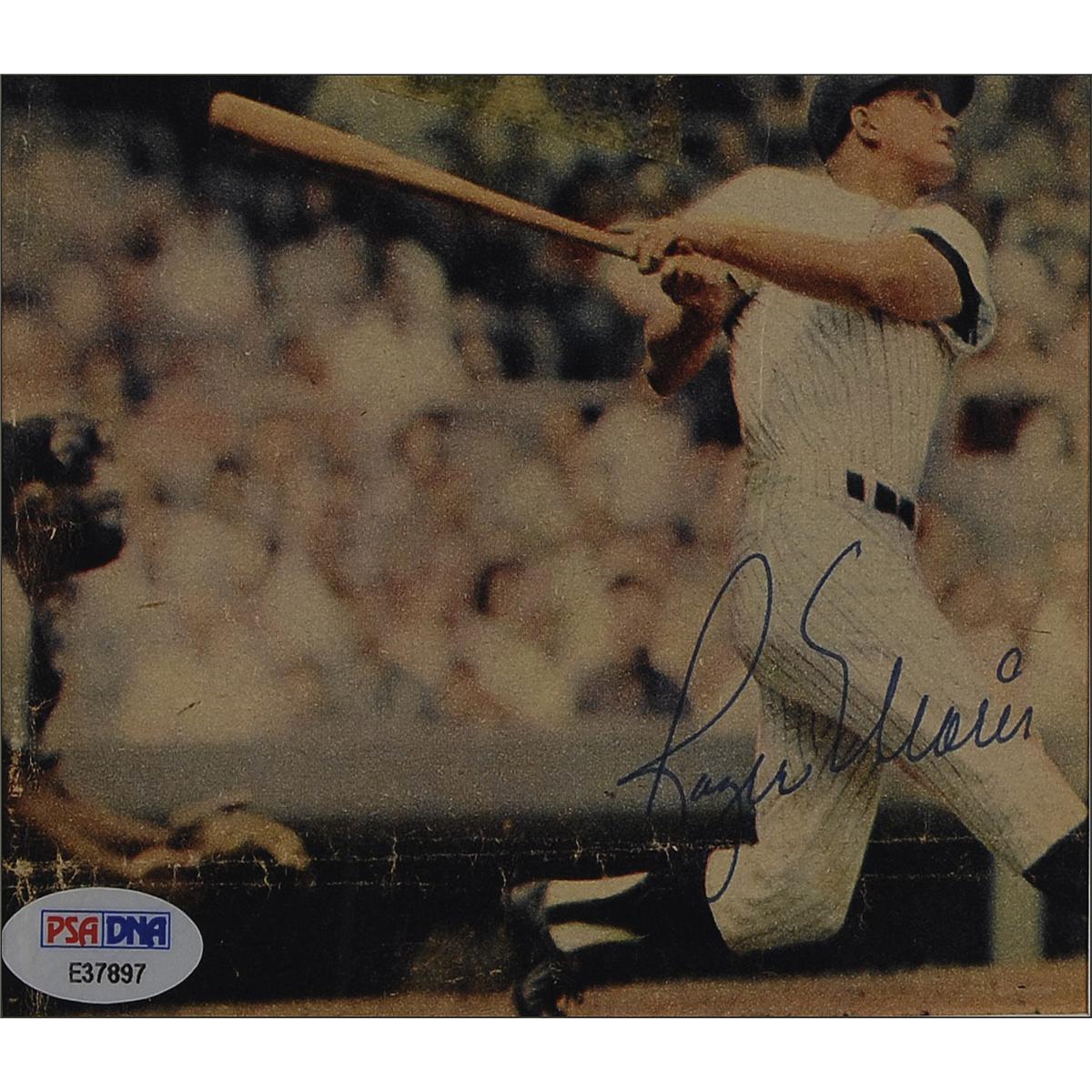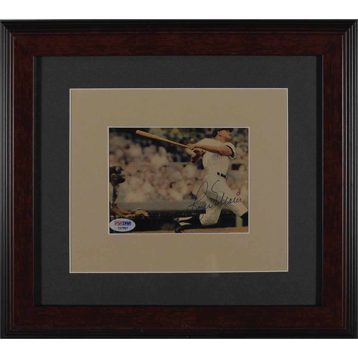 Color 5.25 x 4 magazine photo of Maris swinging for the fences, signed in blue ballpoint. Double matted and framed to an overall size of 14 x 12.5. In fine condition, with two intersecting folds each lightly touching his name, old tape residue at the top edge, and a PSA/DNA authentication label affixed at the bottom left corner. Accompanied by a full letter of authenticity from PSA/DNA.