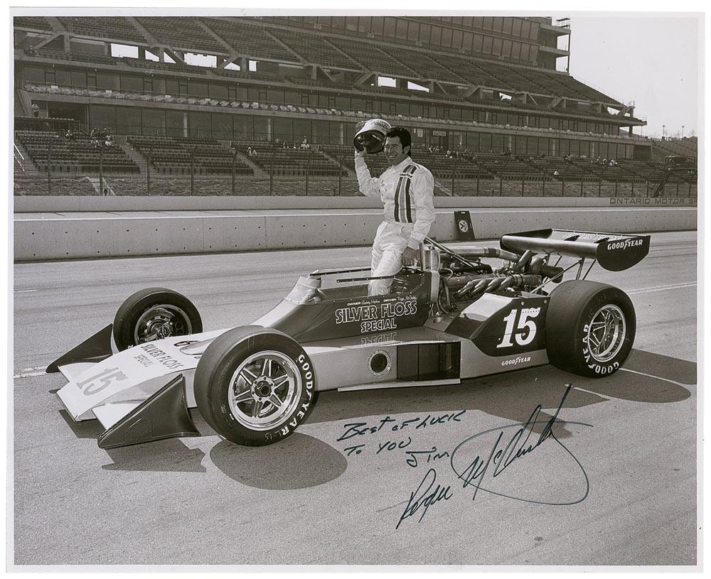Longtime race car driver (1930–1993). Glossy 10 x 8 photo of McCluskey posing with his Silver Floss Special, signed and inscribed in black felt tip “Best of luck to you Jim, Roger McCluskey.” In fine condition.