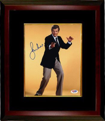 Sir Roger Moore is most notable role is that of the British secret agent James Bond, whom he portrayed in seven feature films between 1973 and 1985; he remains the oldest actor to have played the character. Moore was cast as Bond in 1973 and portrayed him in Live and Let Die (1973); The Man with the Golden Gun (1974); The Spy Who Loved Me (1977); Moonraker (1979); For Your Eyes Only (1981); Octopussy (1983); and A View to a Kill (1985). Roger Moore has hand signed this James Bond 8x10 Photo. PSA Hologram and Certificate of Authenticity. Custom Black Mat and Premium Mahogany Color Framed as shown.
