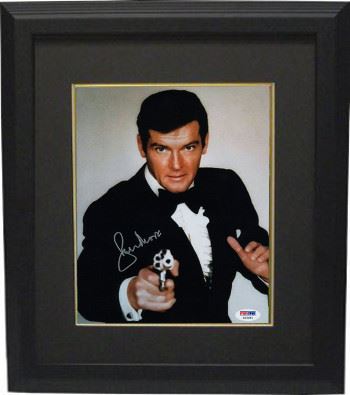 Sir Roger Moore is most notable role is that of the British secret agent James Bond, whom he portrayed in seven feature films between 1973 and 1985; he remains the oldest actor to have played the character. Moore was cast as Bond in 1973 and portrayed him in Live and Let Die (1973); The Man with the Golden Gun (1974); The Spy Who Loved Me (1977); Moonraker (1979); For Your Eyes Only (1981); Octopussy (1983); and A View to a Kill (1985). Roger Moore has hand signed this James Bond 8x10 Photo. PSA Hologram and Certificate of Authenticity. Custom Black Mat and Premium Black Frame as shown.
