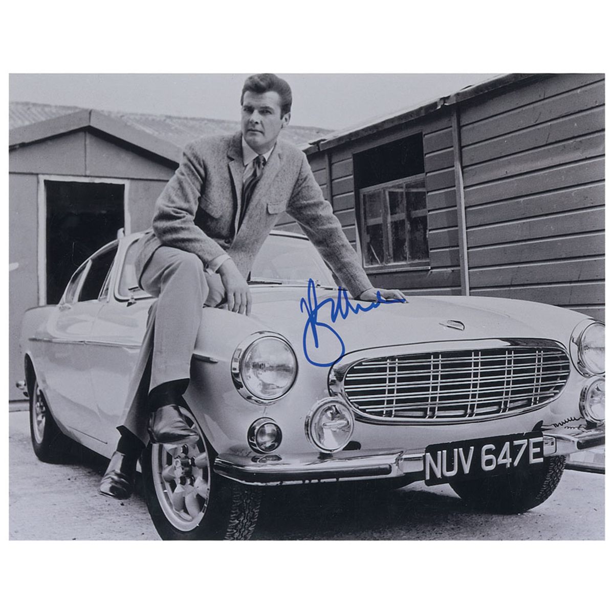 Debonair glossy 14 x 11 photo of Moore sitting on the hood of a car, signed in blue felt tip. In fine condition, with light corner tip creases and a bit of mild staining.