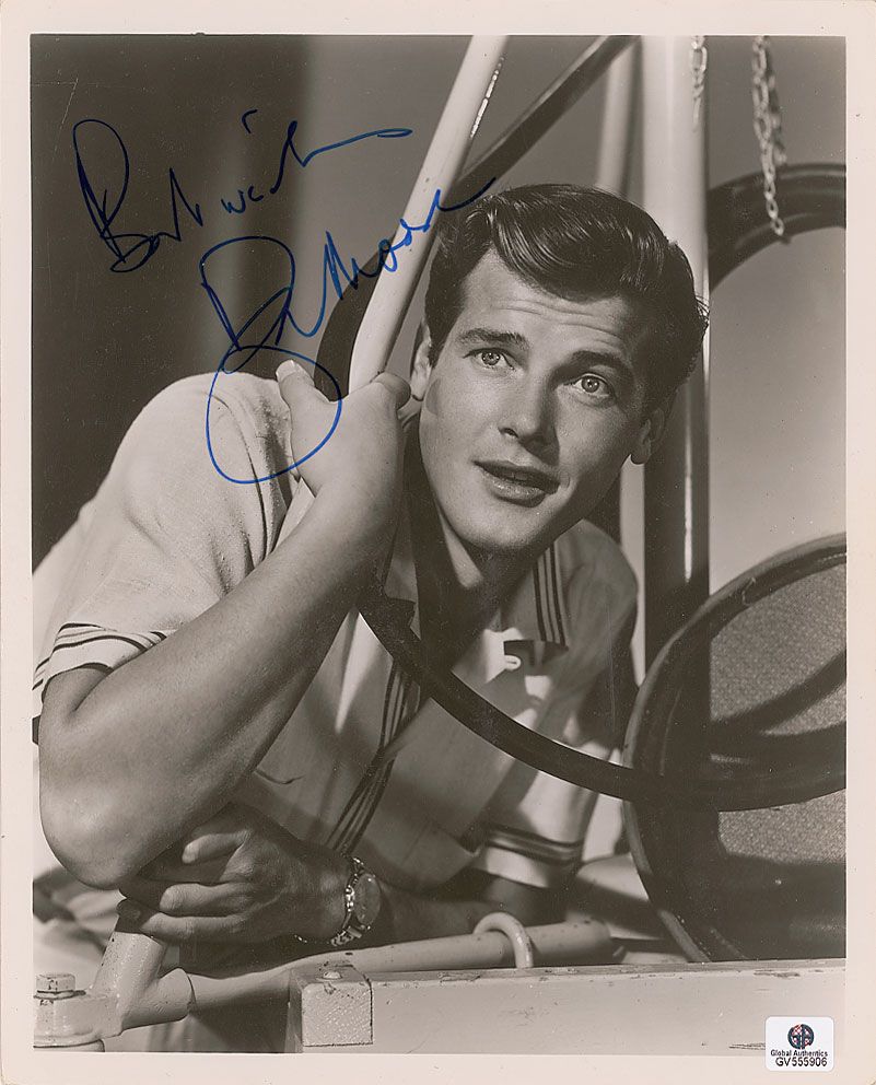 Vintage glossy 8 x 10 photo of Moore peering out from some machinery, signed later in blue felt tip. In very good condition, with scattered creases and an authentication label affixed to lower right.