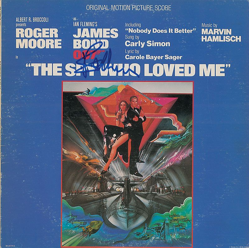 Original motion picture score for The Spy Who Loved Me album signed on the front cover in blue felt tip. In fine condition, with a mild ‘ring of wear’ to front cover as well as some scattered edge wear. The record is included.