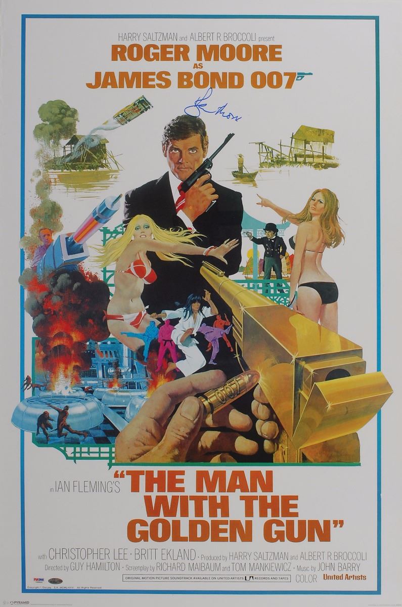 Two James Bond posters with classic artwork by Robert McGinnis, Dan Goozee and Renato Casaro, both signed in blue felt tip by Roger Moore: a color 24 x 36 poster for the 1983 film Octopussy, and a color 24 x 36 poster for the 1974 film The Man with the Golden Gun. Both are rolled and in overall fine condition, with a few scattered creases. Both are accompanied by certificates of authenticity from PSA/DNA.