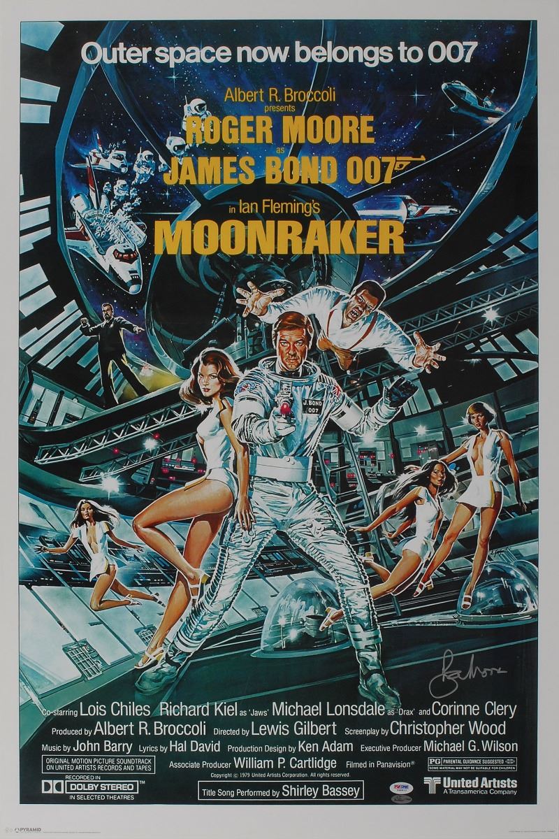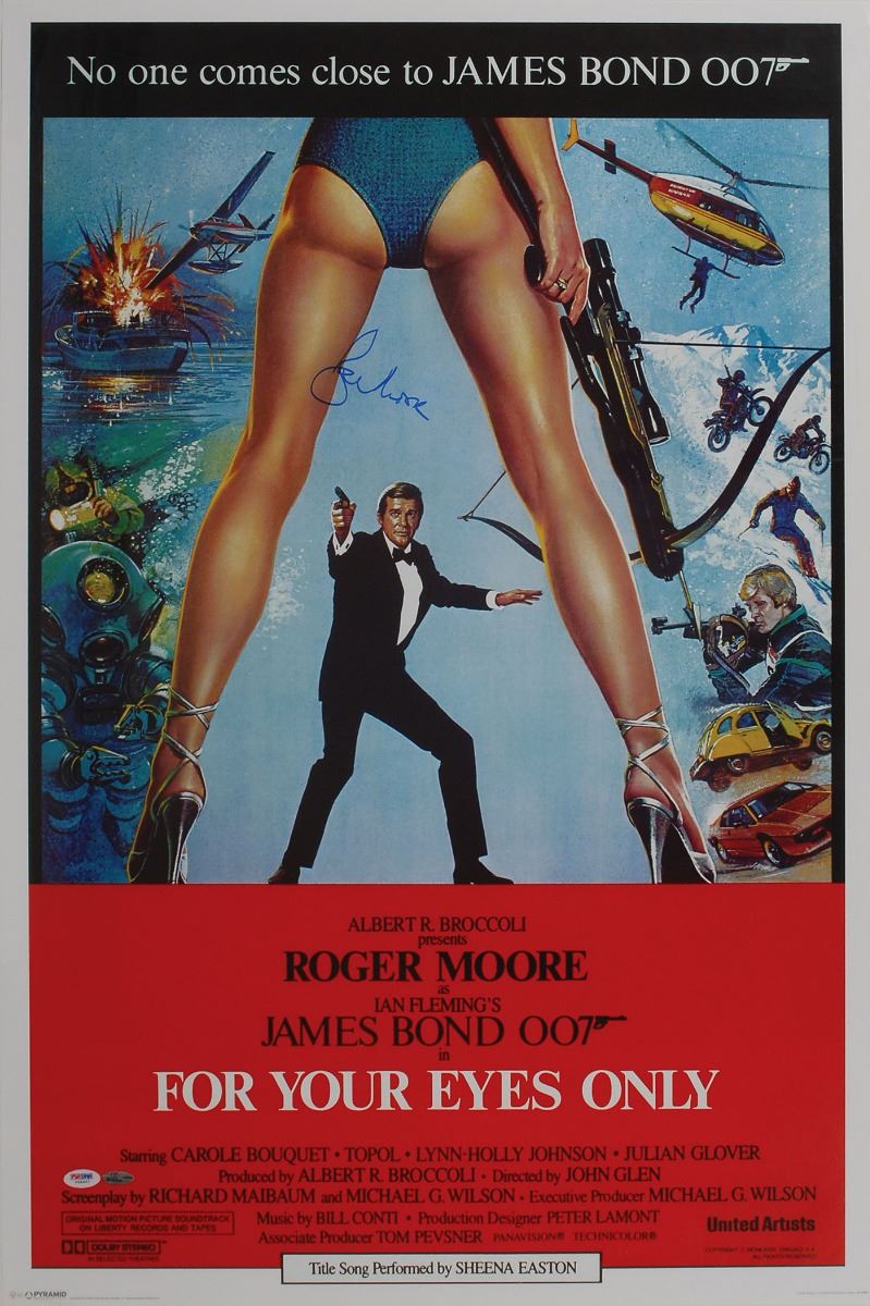 Two James Bond posters with classic artwork by Dan Goozee and Bill Gold, both signed in blue felt tip or silver ink by Roger Moore: a color 24 x 36 poster for the 1981 film For Your Eyes Only, and a color 24 x 36 poster for the 1979 film Moonraker. Both rolled and in overall fine condition, with a few scattered creases. Both are accompanied by certificates of authenticity from PSA/DNA.