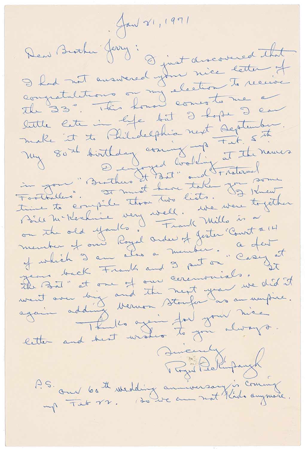 Shortstop who played for the Indians, Yankees, Senators, and White Sox. ALS, one page, 6.5 x 10, January 21, 1971. Letter to a fellow Mason. In part: “I just discovered that I had not answered your nice letter of congratulations on my election to receive the 33°…I enjoyed looking at the names in your ‘Brothers at Bat’ and ‘Fraternal Footballers.’ It must have taken you some time to compile those two lists. I knew Bill McKechnie very well. We were together on the old Yanks. Frank Mills is a member of our Royal Order of Jester Court #14 of which I am also a member. A few years back Frank and I put on ‘Casey at the Bat’ at one of our ceremonials. It went over big and the next year we did it again adding Vernon Stoufer as an umpire.” In very fine condition.