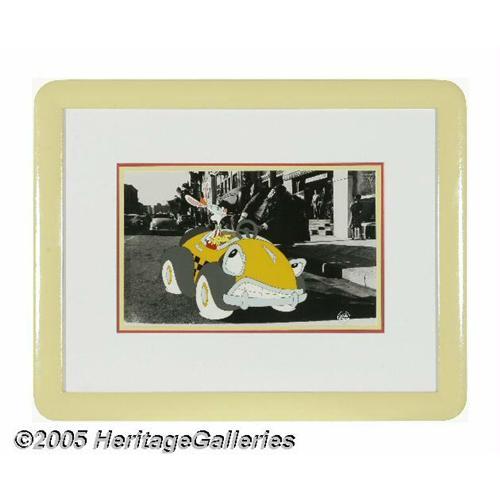 <B>Who Framed Roger Rabbit Serigraph (The Walt Disney Company, undated).</B></I> This sericel is based on a scene taken from the technically-marvelous landmark film, ""Who Framed Roger Rabbit"" (1988), which blended animated, ink-and-paint cartoon characters with flesh-and-blood live actors. In this scene hapless, no-nonsense private eye, Eddie Valiant, hops into Benny the Cab, where Roger waits. The sericel is placed on top of a photo image of Eddie Valiant (Bob Hoskins), which was taken from the film. The image area measures 13"" x 8"" and the art is in Excellent condition. <BR><BR><B>Important notice:</B> Heritage usually auctions material at the rate of 200-250 lots per hour. On some occasions eBay Live bid software or the Internet may not be able to keep up with the pace of the auction. We recommend placing a realistic absentee bid now as insurance to avoid disappointment. Occasionally the auctioneer may eliminate or reject an eBay Live bid, and the auctioneer may also reopen a lot after the close of the eBay live bidding (usually because we missed an audience bid), and may reject your bid even if it shows you as the winning bidder. By bidding via eBay Live, you agree that Heritage may award the lot to another bidder at its sole discretion under the circumstances described above or any other reasonable circumstances. Since eBay bids are not shown to us until we open the lot on the floor, we treat those bids just like floor bids. In most cases the floor responds before the eBay bid is presented to us, due to Internet lag time, so for consistency we have made it a policy that floor bids are always considered first over tie eBay live bids. Also please note that all Heritage lots purchased through eBay Live carry a 20% Buyer's Premium. Please make sure you read the Terms and Conditions before you bid. This lot is being auctioned in conjunction with a live floor auction by Heritage Galleries & Auctioneers. All final auction and invoice information will be supplied b