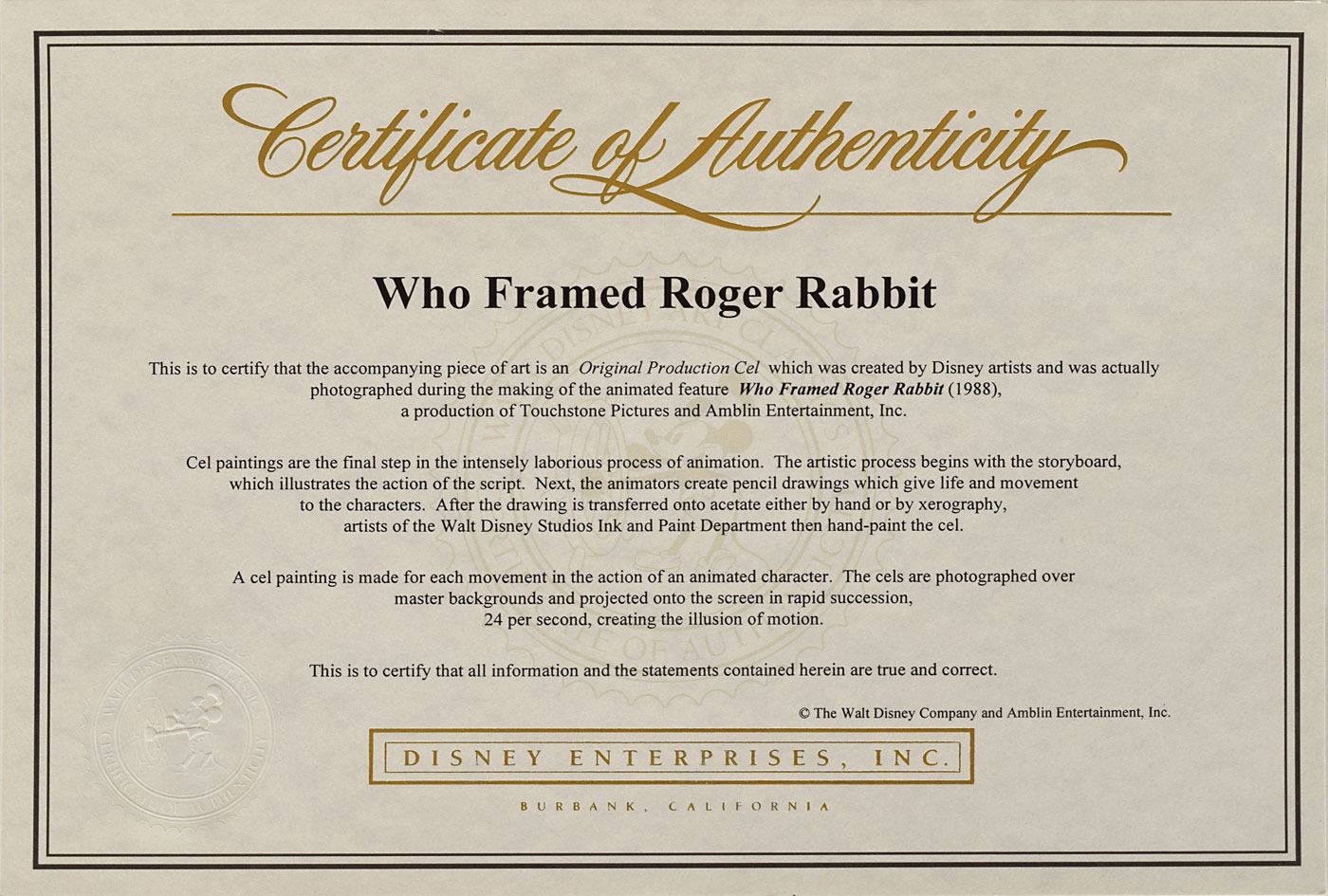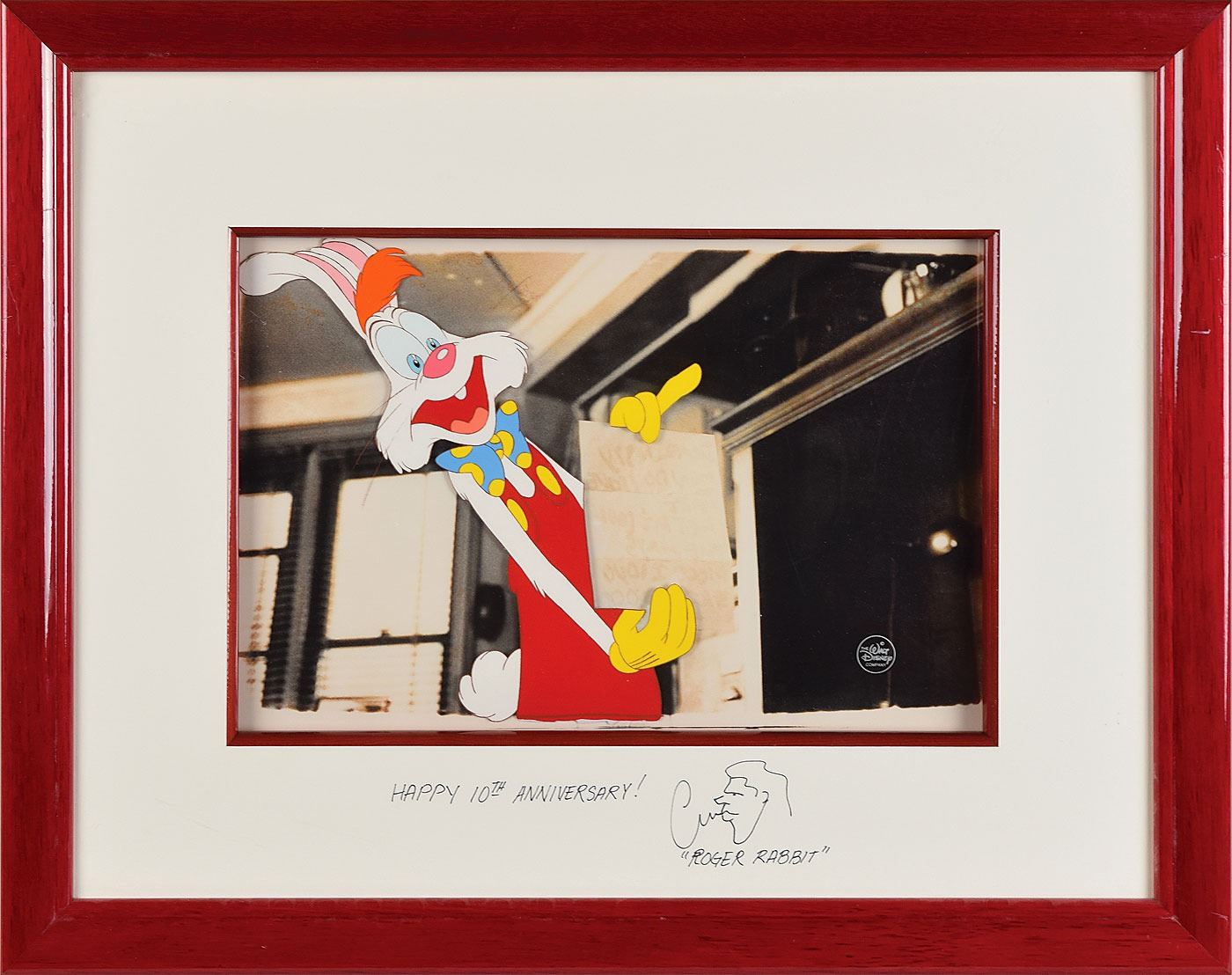 (Walt Disney Studios, 1988) Original production cel of the famed title character from Who Framed Roger Rabbit?, signed on the mat in black felt tip by voice actor Charles Fleischer, who adds a self-portrait sketch and "Happy 10th anniversary! 'Roger Rabbit.'" The cel is placed on a Disney lithograph background. Character image measures 8.25 x 8.5, with a mat opening of 13.25 x 8.75. This piece is framed to an overall size of 21.5 x 17.25 and bears the silver Walt Disney Company seal to lower right. In fine condition. Accompanied by a certificate of authenticity from the Walt Disney Company.