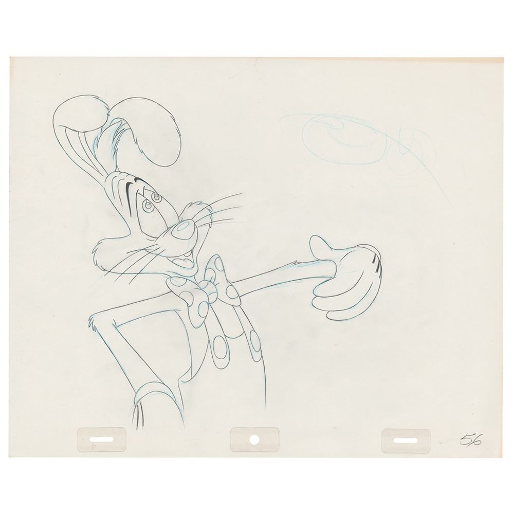 (Walt Disney Studios, 1988) Great original production drawing featuring Roger Rabbit from Who Framed Roger Rabbit, showing the title character in a large half-length pose. Accomplished in graphite and colored pencil on untrimmed 13 x 10.5 animation paper, marked "56" in the lower right corner. Image measures 8.5 x 9. In fine condition.