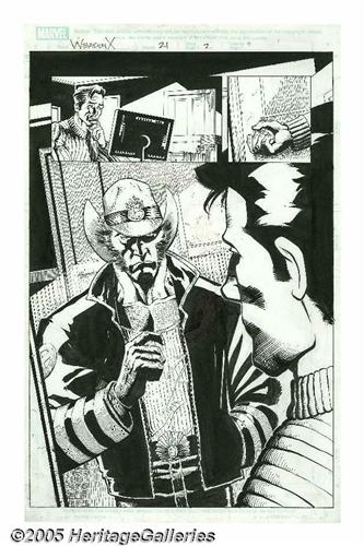 <B>Roger Robinson and James Pascoe - Weapon X #21 Complete 22-page Story, "Countdown to Zero: Part 3" Original Art (Marvel, 2004).</B></I> It all comes to a head in this issue, the third installment of the "Countdown to Zero" story arc: Agent Zero is the original Maverick, and the impostor Maverick is actually Bolt from the New Warriors. Confused? Well, it really won't matter when you point your peepers at this incredible lot of highly dramatic pages featuring everybody's favorite X-Man, Wolverine, who maintains his reputation as the cuddliest and most sweet-natured of all superheroes. There's plenty of gunplay, secret hideouts, and high drama to go around. Artist Roger Robinson kicks out the jams on these 22 pages, making this a real treat for any Logan fan. The artwork is in Excellent condition, with pencil layouts on the reverse side of each page. The image area of each page measures 10.5" x 15.5".