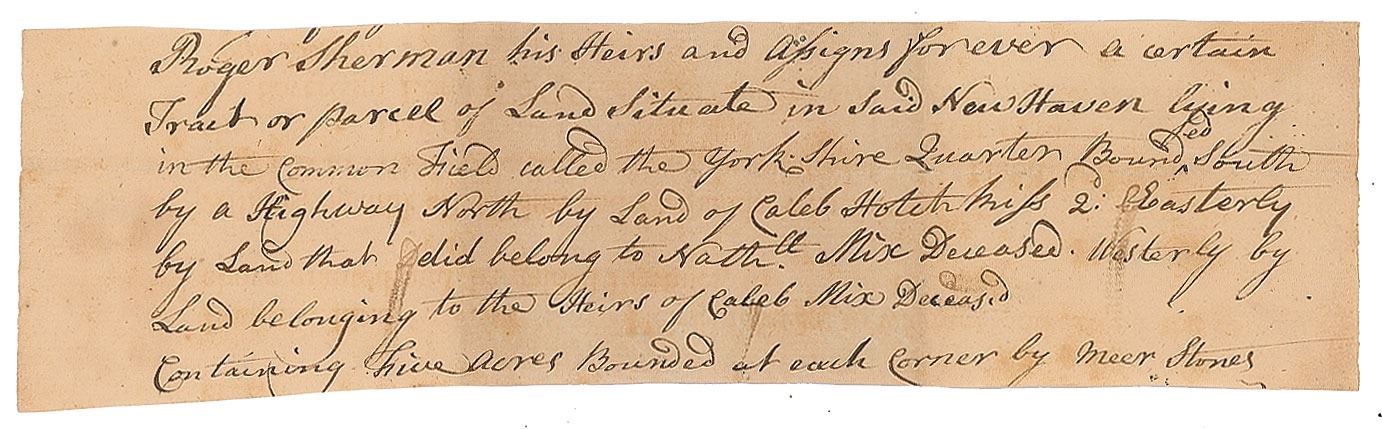 Partial third-person ADS, one page, 8 x 2.25, no date. Document pertaining to real estate, in part: "Roger Sherman his Heirs and Assigns forever a certain Tract or parcel of Land Situate in Said New Haven being in the Common Field called the Yorkshire Quarter Bounded South by a Highway North by Land of Caleb Hotch Miss 2d: Easterly by Land that did belong to Nath'll Mix Deceased, Westerly by Land belonging to the Heis of Caleb Mix Deceased, Containing Five acres Bounded at each corner by Meer Stones." In fine condition, with light toning to the center and trimmed edges.